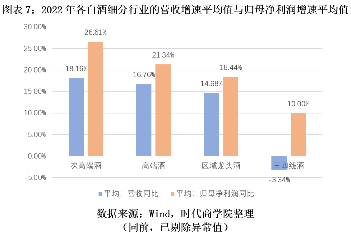 白酒行业可以进一步细分为高端酒、次高端酒、区域龙头酒、三四线酒行业。2022年,这四个细分行业中,次高端酒企业在营收增速平均值与归母净利润增速平均值上的表现都排名第一。