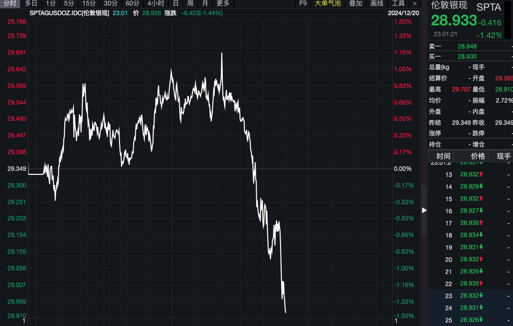 黄金白银明显跳水。现货白银跌破29美元/盎司,为今年9月以来首次,日内下跌1.42%。